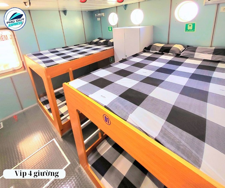 Khoang giường VIP tàu Phú Quý Express gồm tất cả 4 giường và được bố trí ở đầu tàu có không gian yên tĩnh thích hợp để nghỉ ngơi. Cấu trúc mỗi phòng gồm có 2 tầng giường và mỗi tầng 4 giường, tổng có 2 phòng 8 giường. Phù hợp với hành khách đi theo nhóm bạn, gia đình hoặc muốn nghỉ ngơi, trải nghiệm tiện nghi, riêng tư.
