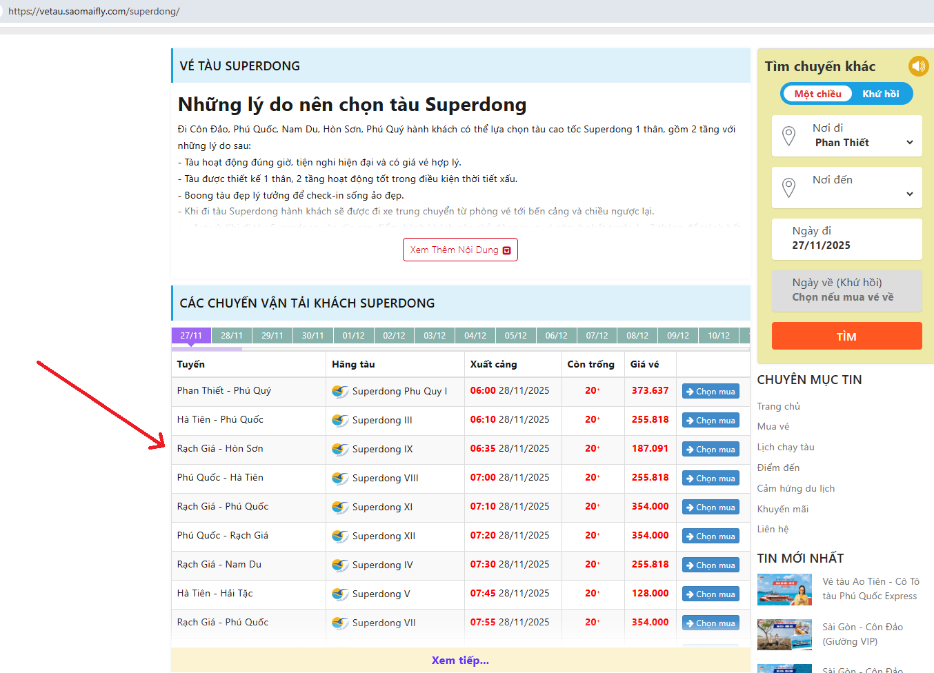 Hành khách đặt vé tàu Superdong đi Hòn Sơn online tại: https://vetau.saomaifly.com/superdong/ và chọn chuyến tàu có thời gian khởi hành phù hợp. Sau đó click “chọn mua” để tiếp tục mua vé.