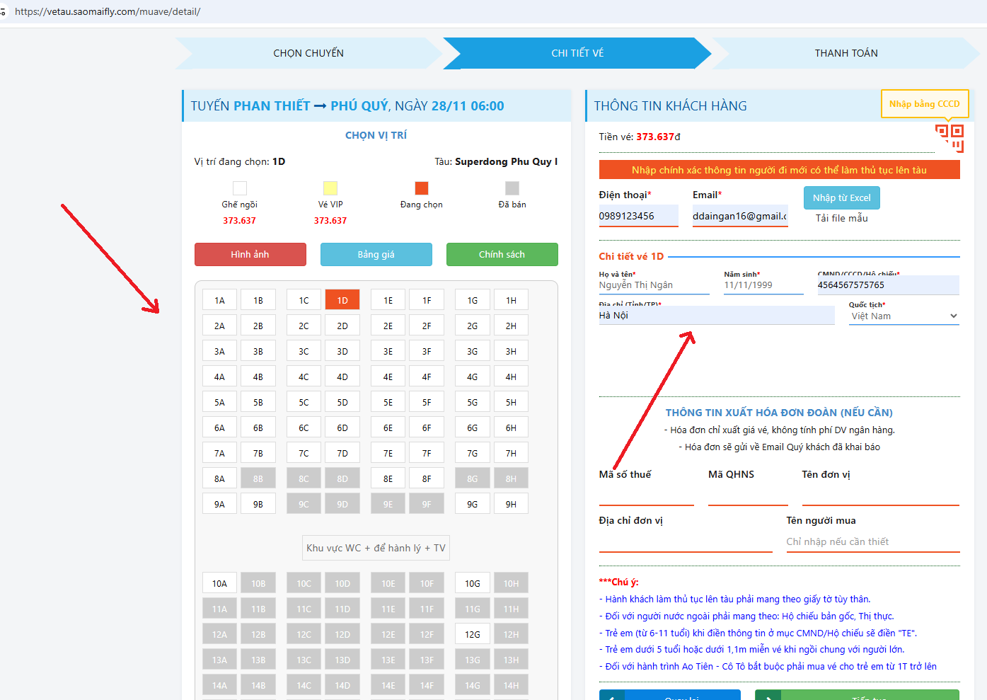 Sau đó hành khách điền đầy đủ thông tin gồm: điện thoại, email, họ tên, năm sinh, CCCD, địa chỉ và quốc tịch.
