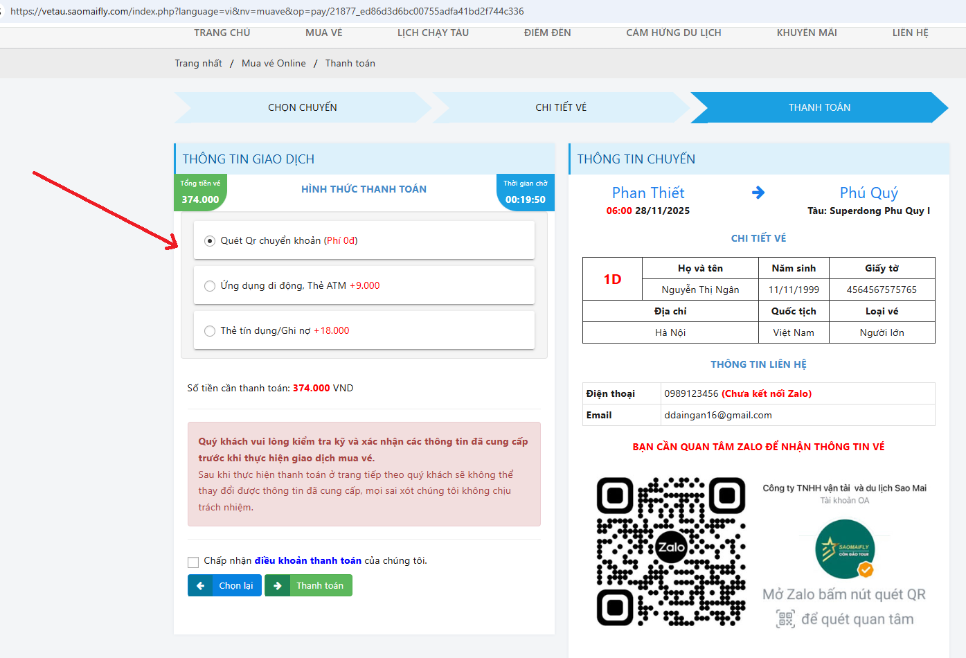 Lựa chọn hình thức thanh toán vé tàu Rạch Giá - Hòn Sơn gồm: